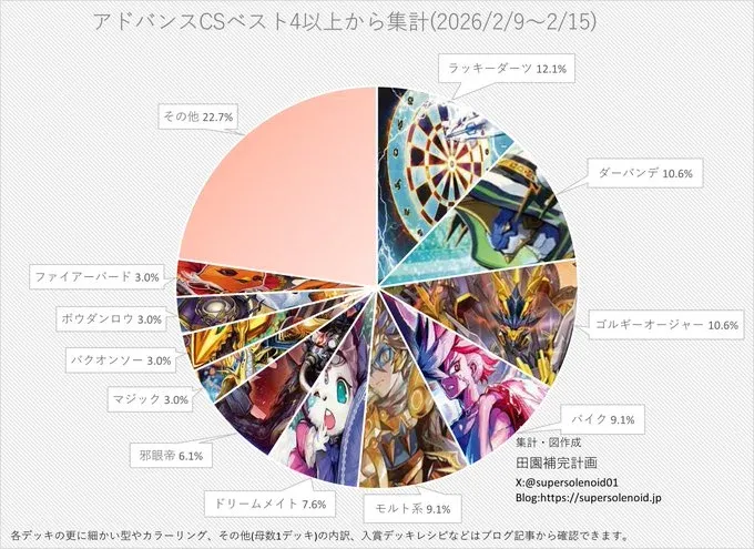 順に【ドリームメイト】が最大母数、【ゴルギーオージャー】も次点で多く、【水闇コンプレックス】や【ペテンシーバース】などのデッキは【ゴルギーオージャー】を避けられないという理由で使用者は少ない想定であれば、使用デッキは【4Cダーバンデ】が好ましい。
