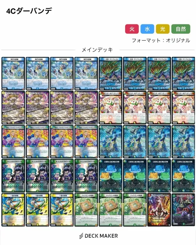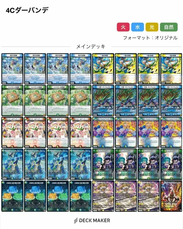 一般的には《一音の妖精》や《ジャスミンの地版》のどちらかを4枚目として採用されており、《煙幕の聖沌 k3mur1 / 聖沌忍法 メカくしの術》が3枚となっている構築が多くみられていましたが、序盤以外で腐り《キユリのASMラジオ》の外れでもある《ジャスミンの地版》の優先度は低めで、ワンショットが強みの【4Cダーバンデ】の出力を最大限発揮するた為に《煙幕の聖沌 k3mur1 / 聖沌忍法 メカくしの術》は4枚必須だという結論に至りました。